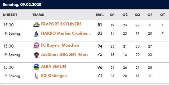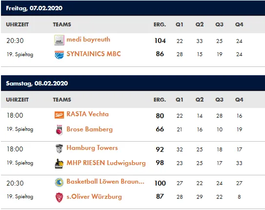 El último partido que se tenía que jugar de la jornada 19, se aplazó debido a la tormenta que azota parte de Alemania estos días. No se ha puesto fecha de recuperación de este partido, que iba a ser el debut del nuevo entrenador de Telekom Baskets Bonn, Will Voigt.