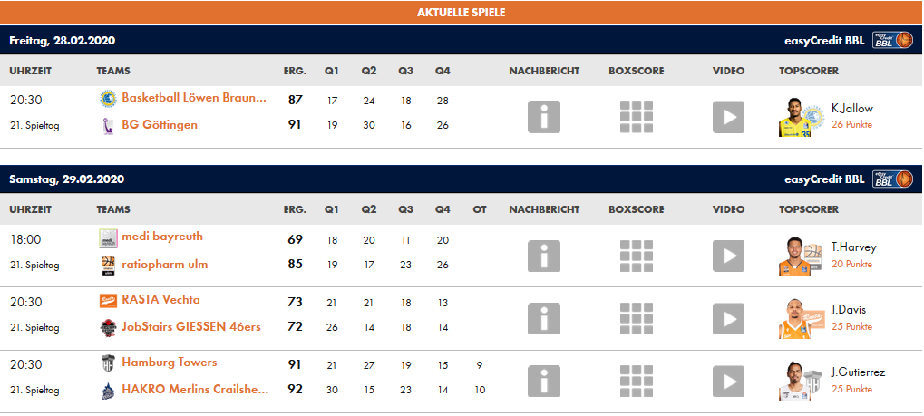 Primera victoria de Ulm después de la marcha de Zoran Dragic a Baskonia. Con ello, aprietan los puestos de playoffs, y alejan un poco a Medi Bayreuth de ellos. El juego comenzó igualado entre ellos, con un predominio del ataque, que luego en el segundo cuarto cambió al imponerse las defensas de ambos. Bayreuth se fue al descanso por delante con una ventaja mínima de dos puntos. Y sería en el tercer cuarto, cuando Ulm rompería el encuentro. Los visitantes aprovecharon las pérdidas de balón de su rival y le endosaron un parcial de 4-16. Aunque Bayreuth intentaría remontar en el último cuarto, sería ya demasiado tarde para ello.