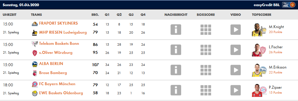 No hubo mucho partido en Frankfurt entre Fraport Skyliners y Ludwigsburg, dos equipos que destacan en defensa, y que esta vez funcionó mejor la del conjunto visitante. El primer cuarto estuvo muy parejo, y Ludwigsburg solo buscaba la manera de romper el ataque de Fraport. Y sería en el segundo cuarto cuando lo conseguiría con un parcial de 8-18, que los mandaría al descanso con ventaja. Tras la reanudación, el liderazgo de Ludwigsburg sería mayor, sobre todo porque Fraport intentó mejorar su acierto en el tiro, sin suerte, y con un pobre porcentaje de tres de tan solo 19 %. Al final, una nueva victoria de Ludwigsburg, que se mantiene segundo en la tabla.