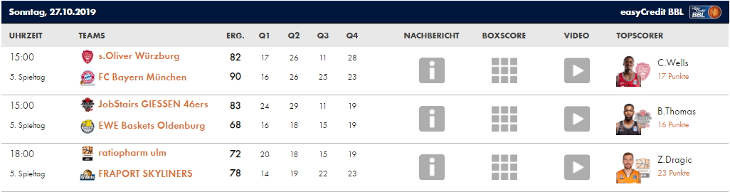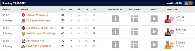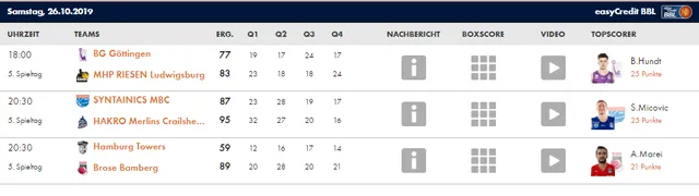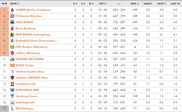 La jornada 5 de la liga alemana nos ha traído interesantes encuentros. De nuevo continua la sorpresa con HAKRO Merlins Crailsheim como líder, invicto, junto al ‘todopoderoso’ Bayern, que sufrió algo más de lo esperado con Würzburg. Brose Bamberg mostró buenas sensaciones ante Hamburgo, y ALBA Berlín no jugó al haber ya jugado el partido correspondiente de esta jornada ante RASTA Vetcha el pasado 2 de octubre con un resultado de 101-78. Os traemos el resumen de lo sucedido este fin de semana: