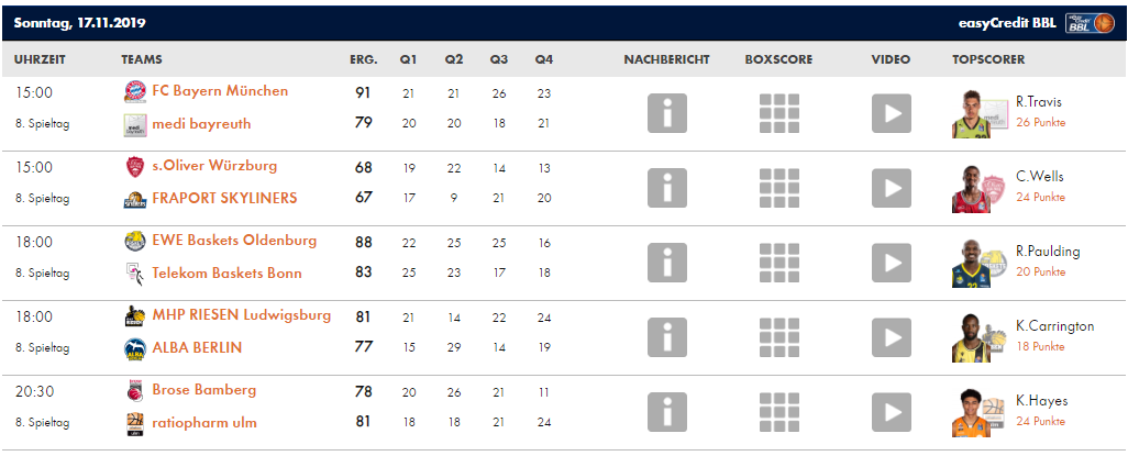 Nueva victoria del Bayern München que se mantiene líder de la Bundesliga. Medi Bayreuth, sin embargo, se mantuvo con opciones hasta la mitad del tercer cuarto tras comenzar muy bien en el partido. El Bayern sacó ventaja en el segundo cuarto, pero el conjunto visitante se recuperó y las cosas se volvieron a equilibrar al descanso. Así hasta la mitad del tercer cuarto, cuando se rompió el partido, que siguió con Bayern al frente y Medi Bayreuth dejándose llevar. Jugador destacado: R. Travis (26 puntos).