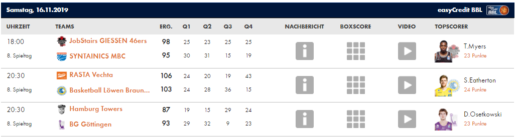 Göttingen ha conseguido su segunda victoria consecutiva y lo hizo en casa de Hamburg Towers, en un partido en el que Solobasket estuvo presente, y que fue el primer partido ante su público de Jorge Gutierrez. Göttingen empezó con ritmo en el encuentro, mientras a los locales les costó entrar, tanto que hasta la segunda parte, no fueron capaces de plantar cara al juego de Göttingen, que se mantuvo solido hasta la mejora de Hamburgo, que hizo un parcial de 29-9 para colocarse con opciones en el último cuarto. El desorden de ideas y el poco acierto en el tiro exterior, dio de nuevo alas a que el equipo rival se llevara la victoria, aunque tuvo que luchar por ella hasta el último segundo. Jugador destacado: D. Osetkowski (23 puntos)