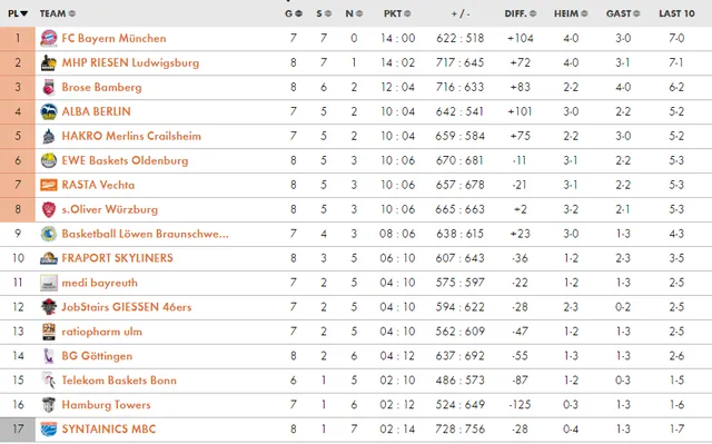 Partidos igualados decididos en los últimos minutos. Ante una liga en la que prima el ataque, la octava jornada de la Bundesliga nos ha regalado encuentros muy igualados y nada aburridos, con ‘sorpresas’ como las derrotas de Brose Bamberg y ALBA Berlín, este último cayó derrotado por Ludwigsburg que pasa a ocupar la segunda posición de la tabla, tras el líder Bayern Múnich, que sigue sin perder en lo que llevamos de temporada.