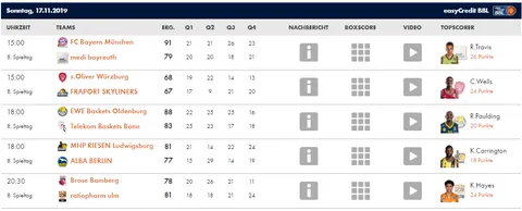 Otro partido que se decidió en los instantes finales en esta jornada de la liga alemana. Tras un período de igualdad entre ambos equipos, Wurzburg tomó ventaja y se fue con amplia diferencia al descanso, gracias a un mal segundo cuarto de su rival Fraport Skyliners. Pero estos entraron más fuertes y acertados, y comenzaron una remontada que aunque nunca se llegó a hacer realidad, casi lo consigue. Les faltó tiempo, pues la reacción no bastó, y los locales se llevaron la victoria por tan solo un punto. Jugador destacado: C. Wells (24 puntos, 28 de valoración)