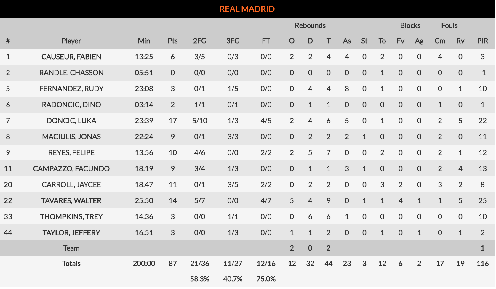 Masacre en las alturas. El dominio en el rebote permitió al Madrid tener el partido bajo control durante los 40 minutos. Los porcentajes de los turcos no eran buenos y entre Tavares, Doncic, Maciulis y Thompkins, se encargaron de que no tuvieran segundas opciones, que sí conseguían en el aro contrario. 44 capturas de los blancos por 27 de los azules.