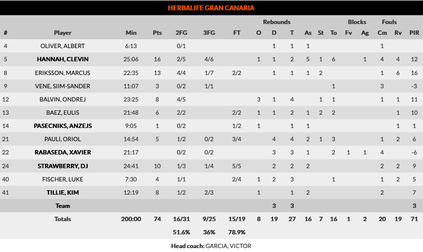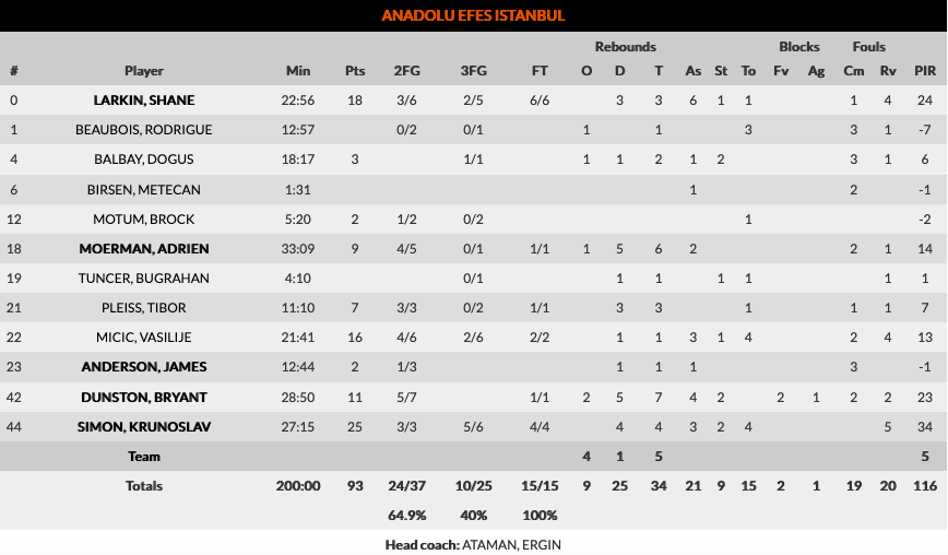Estrellas: Ataman maneja una rotación cargada de estrellas y el nivel de su equipo, esta temporada, está siendo acorde al nivel de la plantilla otomana. Demasiada diferencia entre ambos equipos. El Granca solo pudo competir con Efes en el segundo cuarto, ya que en el resto hubo una gran diferencia entre ambos. Jugadores de gran calidad, como Beaubois (-7 de valoración), Anderson o Motum no tuvieron su día, pero tampoco fueron necesarios por la profundidad del roster de los turcos.