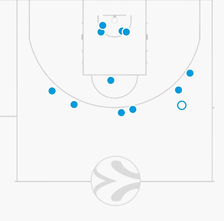 En este gráfico podemos ver los tiros de Larkin en el juego 3, en el que se fue a 30 puntos y falló solo un tiro, del del punto blanco. Como podemos apreciar, es un jugador que genera y no un tirador de catch and shoot. Sus pick&roll con Dunston fueron un problema en muchos momentos porque el Barça se preocupó más por la caída del pivot que por no liberar tiros a los exteriores. Sin embargo, en el último encuentro pudimos apreciar que Pesic ordenó a Claver que fuera él el encargado de defender a Larkin y cumplió el objetivo con creces, puesto que ejerció de defensor principal durante la segunda mitad y aquí el estadounidense solo anotó 6 puntos.