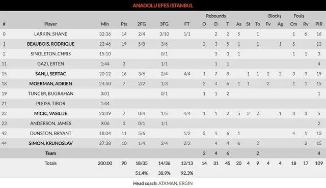 La dirección y movimiento de balón creada a través de Vasilje Micic. La aportación anotadora de Shane Larkin y Rodrigue Beaubois, tanto a nivel individual como en ritmo colectiv, y la aportación atrás de Simon y Moerman cerraron la zona turca y la presión sobre las líneas de pase provocó numerosos tiros forzados y es la clave en la transición de Anadolu y romper el partido de manera clara y directa.