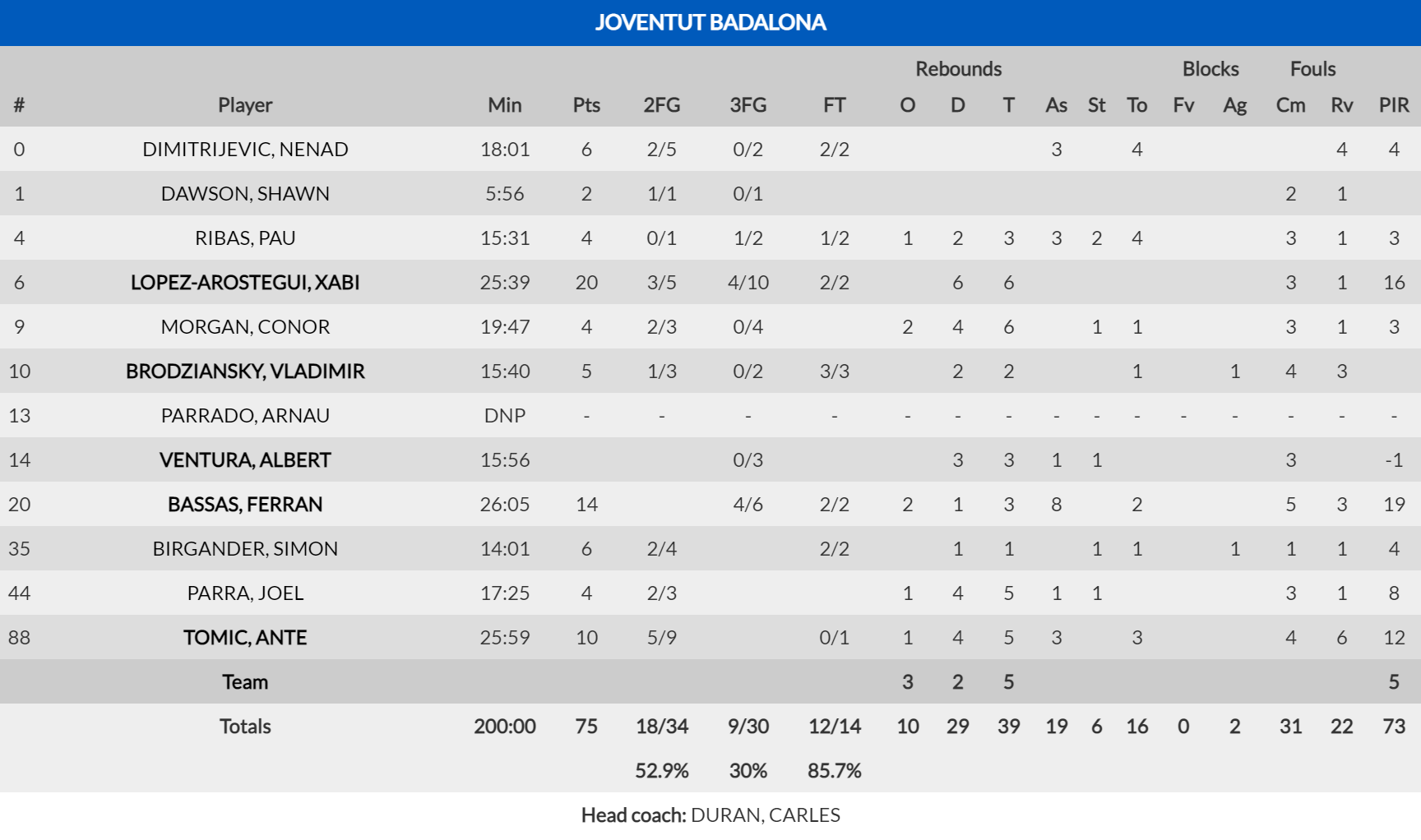Si bien la mayoría esperaba un encuentro ofensivo, Carles Duran sorprendió con un guión totalmente fuera de lo previsto. Consciente del potencial ofensivo de los locales, la Penya trató de llevar el partido al terreno que le interesaba para plantear un choque físico y trabado. La intensidad defensiva de los visitantes logró frenar el rodillo de los italianos para ahogar por completo la circulación de balón de la Virtus, que no fue capaz de encontrarse a sí misma. Un gran mérito por parte del Joventut, que se reinventó por completo con tal de adaptarse a un escenario muy distinto al habitual. Una cara totalmente renovada de los verdinegros que, con una actitud ejemplar, puso contra las cuerdas al mejor equipo de la competición.