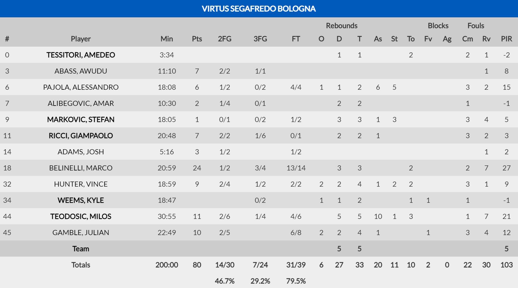 Aunque el baloncesto sea un deporte de equipo, jugadores como Marco Belinelli son la excepción que rompen la regla. El tirador italiano es de aquellos jugadores capaces de decidir un partido en un abrir y cerrar de ojos y, una vez más, demostró porque la Virtus Bologna decidió apostar por él a mitad de temporada. El escolta actuó como desatascador ante la falta de acierto de su equipo y fue determinante para encarrilar un partido que los locales tenían muy patas arriba. Belinelli terminó con 24 puntos, 3 rebotes y 13/14 en tiros libres en tan solo veinte minutos sobre el parqué. Su capacidad para anotar no tiene límite, se le caen los puntos de la mano.