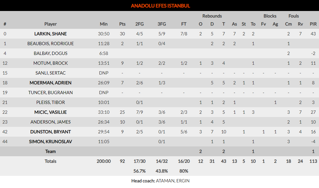 Un Anadolu Efes mucho más activo en ataque se aventajaba a principios del segundo cuarto, de la mano de Anderson y un espectacular Micic. El serbio con 7 puntos seguidos adelantaba a los suyos, obligando a que Obradovic pidiese tiempo muerto para que los de Ataman no les superasen por una diferencia mayor a 10 puntos. El entrenador serbio ponía las pilas a los suyos en defensa, mientras que Sloukas y Mahmutoglu resurgían el ataque desde el triple. Rápidamente Ataman colocaba a Shane Larkin en pista para volver a dar otro ritmo al partido. El estadounidense, en modo multiusos, respondía con 5 puntos consecutivos para irse como máximo anotador, reboteador y asistente del partido con 11 puntos, 6 rebotes y 3 asistencias. Nuevamente, sin Pleiss ni Moerman en pista, el Fenerbahce aprovechaba a buscar a Vesely en el poste. El checo acercaba a los suyos a dos puntos, pero la manita de Anderson volvía a brillar, alejando a los blanquiazules. (40-45)