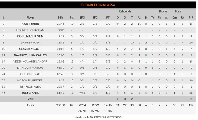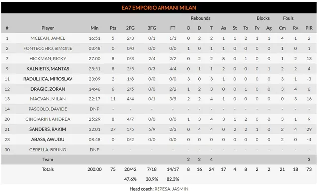 SANDERS DA LA CARA POR LOS SUYOS Hickman sería el encargado de romper la dinámica de fallos con la que había empezado el cuarto (72-54), y es que hasta transcurridos casi dos minutos, ningún equipo había conseguido anotar. El Barça contestaría rápido con una asistencia muy generosa de Dorsey a Vezenkov (74-54). Por su parte, Hickman volvería a sumar otro triple, él y Sanders eran prácticamente los únicos que estaban dando la cara por su equipo. El dúo Dorsey-Vezenkov (20 y 18 de valoración respectivamente) seguía funcionando bien y el americano volvería a asistir a su compañero (79-61). A continuación, Claver pondría la puntilla con un triple que sería contestado rápidamente por otro tanto de Sanders (82-64). A falta de 3 minutos para el final partido estaba 84-66, listo para sentencia. Por su parte, Sanders volvería a hacer de las suyas mediante un aro pasado, el americano realizó un gran encuentro, pero en ningún momento fue suficiente para poner en peligro la victoria blaugrana. La última canasta sería por parte de los italianos, Sanders volvería a anotar otro triple para su casillero para llegar a los 27 tantos. En este último tramo el Barça se dejaría llevar, permitiendo 24 puntos, pero la superioridad blaugrana durante el partido fue absolutamente incontestable. Los de Bartzokas practicaron un gran juego en equipo, mostrando el camino que deben seguir si quieren aspirar a algo al final de la temporada.