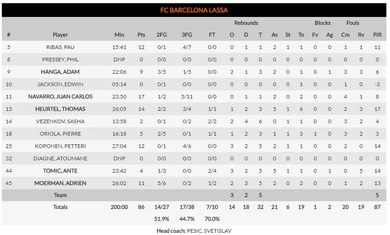 3 Una suerte de exhibiton game: se quejaba amargamente Bartzokas de la ausencia de su sistema defensivo cuando le pusieron un micrófono al descanso, ansioso por evitar despiadados cruces, ahora que por fin ha hecho historia para su equipo, clasificándolo por primera vez para la post temporada de Euroliga. No le hacían mucho caso sus jugadores, permitiendo hasta 17 triples de color blau y grana con un casi 50% de acierto local. Cuando por fin se decidieron a endurecer la contienda, el desajuste en el rebote y en el marcador era tal que aquello ya no tenía arreglo. Finalmente, el partido no ganaría el premio a la mayor pachanga jamás jugada en Euroliga, pero poco le faltó para convertirse en un exhibition game.
