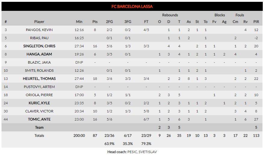 Mandaba Pesic a adelantar sus hordas defensivas y a tirar el fuera de juego en la línea de tiros libres visitante para provocar pérdidas rivales y ponerse por delante con un autogol local (23-25 min. 14). Así de cruda estaba la cosa, justo cuando el omnipresente mejor pagado se secaba el sudor de su lujoso contrato en la banca local. Aprovechaban el resuello los muchachos de Pesic para estirar a +5 la cuenta con un triple de Heurtel, hoy en su versión más benévola, mientras se le desinflaba el porcentaje de fábula a los de azul y amarillo. Un ganchito de izquierdas en blanco y negro de Tomic parecía dejar al Barça Lassa por delante al descanso, pero el octavo triple moscovita estacionaba, sobre el pitido final, la primera parte con los dos equipos equilibrados en 38 puntos.