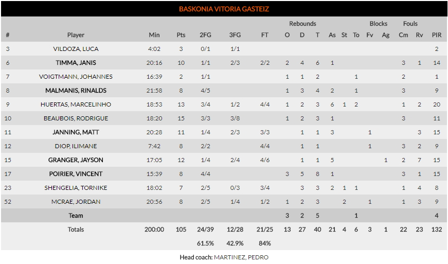 El último periodo se afrontaba con un 88 a 63 en el marcador y con la sensación de que el Baskonia controlaba todos los aspectos del juego. Los últimos minutos del encuentro le sirvieron a Pedro Martínez para dar minutos a sus jugadores menos “enchufados” para que cogieran confianza y ritmo.