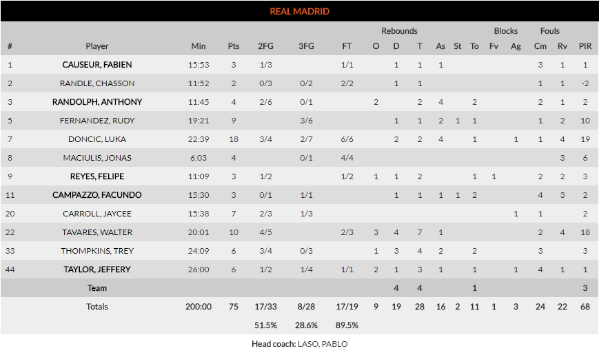 Luka Doncic y Walter Tavares estuvieron muy solos en Real Madrid y nadie les secundó a nivel ofensivo. El canterano del equipo blanco intentó tirar del equipo con 18 puntos, pero por momentos también se vio superado.
