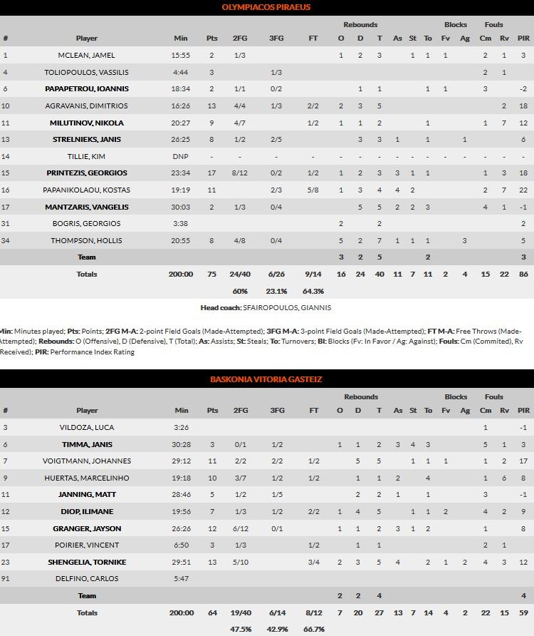 Shengelia y Granger estuvieron muy solos en ataque y el Baskonia se encontró falto de líderes. Cuando alguno de los dos jugadores se encontraba descansando en el banquillo, el equipo se atascaba en ataque. Además, el base se dolió de un golpe durante el encuentro y en unas declaraciones a Radio Vitoria afirmaba que tenía el recto bastante tocado en un pinchazo que le dio en el segundo cuarto. Timma estuvo muy desaparecido y aún se le espera, en especial, por su gran Europeo. En el Olympiakos, Milutinov y Printezis fueron los líderes de su equipo.