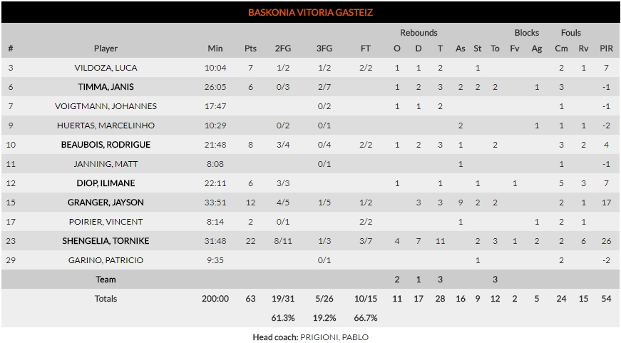 En el Baskonia, una vez más, Shengelia y Granger estuvieron demasiados sólos en ataque. Ambos fueros los máximos anotadores de su equipo, en especial, el capitán y georgiano que por momentos se vio demasiado hasta saturado.