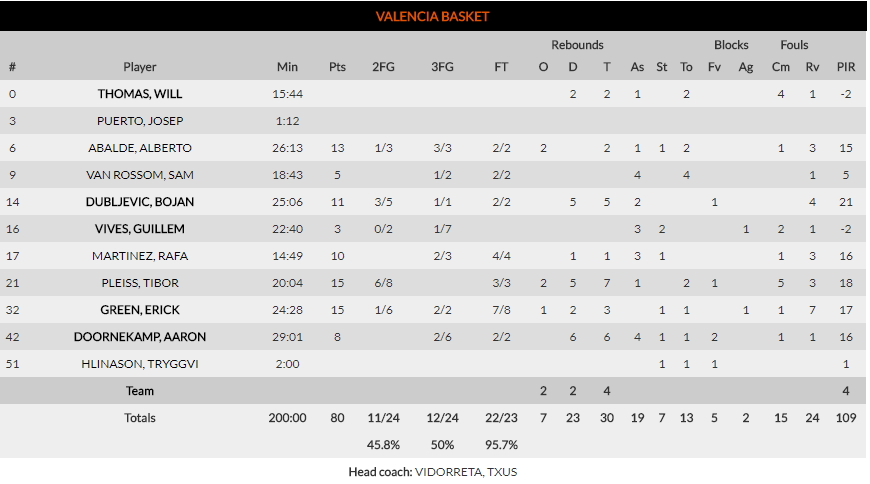 El Valencia estuvo muy acertado también desde el tiro libre con un 22 de 23 intentos. Además, los de Vidorreta también estuvieron finos desde el triple con 12 aciertos de 24, mientras que el Baskonia tuvo un porcentaje más pobre con 5 de 26.