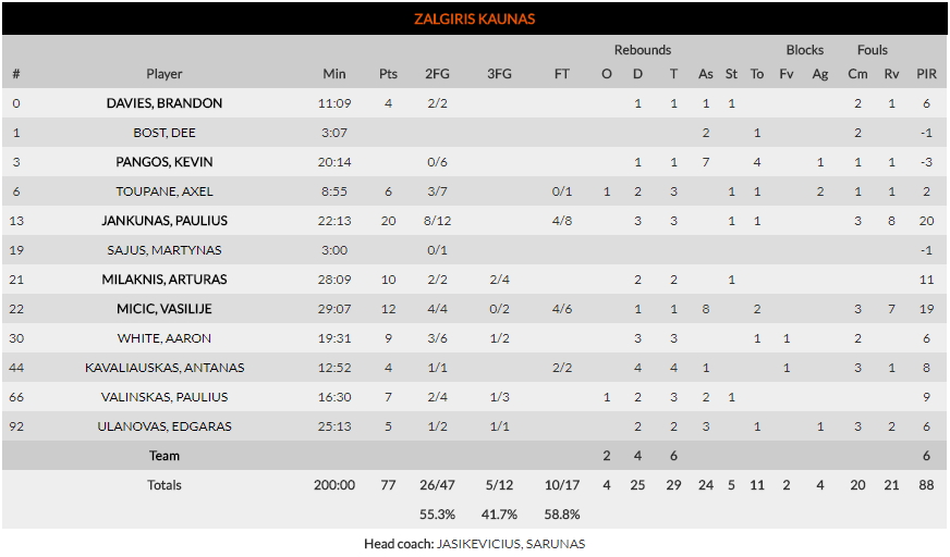El Zalgiris padeció el cansancio de haber jugado un duro encuentro en Málaga, con prórroga incluida, y Jankunas y Micic estuvieron muy solos con 20 y 12 puntos respectivamente.