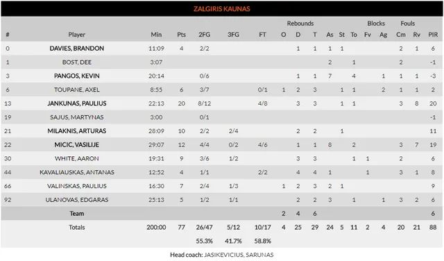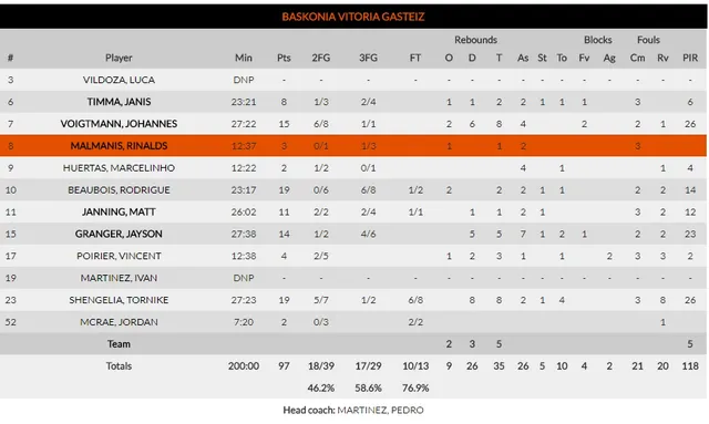 La anotación del Baskonia estuvo muy repartida, hecho que demuestra una vez más que el juego colectivo de los vascos ya es una realidad. Hasta cinco jugadores anotaron más de 10 puntos (Voigtmann 15, Beaubois 19, Janning 11, Granger 14 y Shengelia 19 puntos).