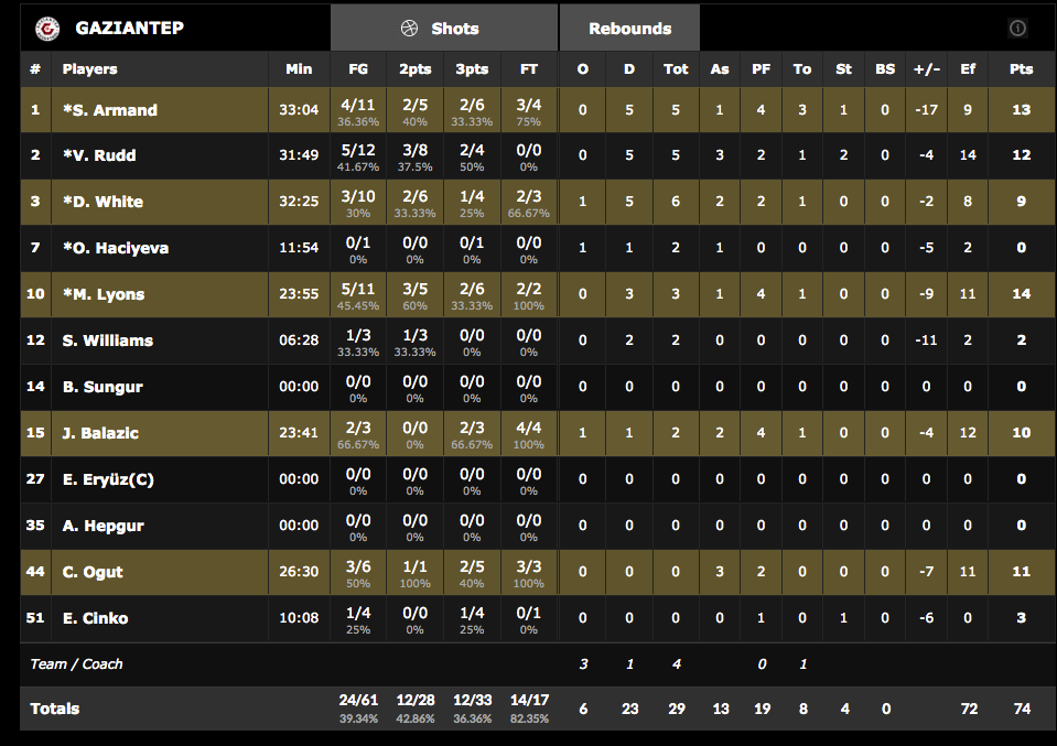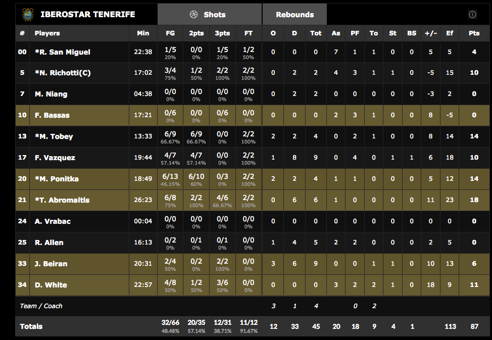 El primer cuarto comenzaba con alternancias en el marcador y siendo un período donde las defensas no es que brillasen demasiado, de hecho, el marcador final lo reflejaba: 21-25 para los aurinegros. Richotti y Abromaitis llevarían el peso del ataque con 10 y 6 puntos respectivamente. El segundo cuarto sería una historia totalmente distinta; comenzaba con un parcial de 0-8 para el equipo turco, y junto al desacierto y la mejoría defensiva no permitía anotar al Iberostar en los primeros 4 minutos del cuarto. Sería Ponitka quien cortaría la mala racha con un mate por la línea de fondo. Esa brecha inicial abierta por los locales se mantendría a lo largo de todo el cuarto gracias a su juego anárquico y al lanzamiento de tres (14 triples anotados entre los dos equipos) con Mark Lyons con 12 puntos y por los visitantes, Tim Abromaitis con 14 para irse al descanso 46-40. Tras el descanso, el Iberostar recortaba 4 puntos seguidos de la mano de Ponitka pero los turcos responderían con dos triples. Varias acciones de Fran Vázquez permitirían empatar el choque a 52. El cuarto continuaría con la alternancia en el marcador, los aurinegros anotando debajo del aro (8 puntos de Tobey consecutivos) y los turcos desde el 6,75 para acabar con 65-67, con 27 puntos de los visitantes en el cuarto. Finalmente, el último período empezaba con canasta de Mike Tobey tras un rebote ofensivo y un triple de Davin White para establecer la máxima del partido, 65-72. La lesión de Tobey auguraba lo peor, puesto que estaba siendo el go to guy en ataque, pero la mejoría defensiva y la actuación de Fran Vázquez (10 puntos-9 rebotes) permitía a los visitantes mantener la ventaja de 7-10 puntos durante todo el cuarto y dos triples de Beirán dejaban la victoria en manos laguneras con el 74-87.