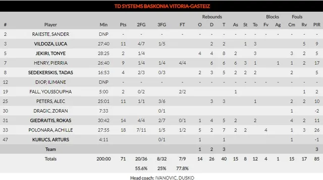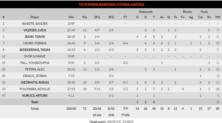 En la reanudación, la puntería taronja se mantuvo intacta durante 5 minutos más (41-56 min. 25). Hasta ese momento, el acierto en lanzamiento exterior de los vitorianos no superaba el 15%. Los de Ivanovic se vieron obligados a tirar de carácter para desplegar su mejor versión defensiva. Dicho y hecho. Jekiri, Henry y compañía construyeron en cancha propia un parcial de 20-2. El último cuarto dictaría sentencia (55-58).