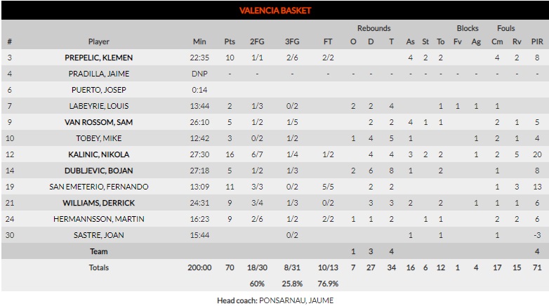 Baskonia creció desde allí para mejorar también las prestaciones en ataque (61-58). De repente, la pegada había cambiado de bando. No sería definitivo, Valencia iba a vender cara su derrota. Con la cuarta falta personal de Giedraitis, la contienda se transformó en una guerra de guerrillas (68-68 min.38). Cada canasta era un suplicio. El triple de Polonara ya no tuvo respuesta (71-70). Nikola Kalinic, 20 de valoración, dispondría incluso de una opción desde el centro de campo para obrar el milagro. La victoria se quedaría en el Buesa Arena. Los dos equipos se acercan en la clasificación; se avecina lucha por un billete para el Play Off.