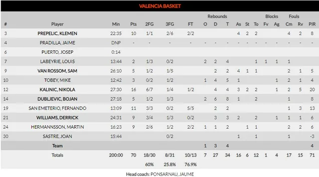 El quinteto inicial de TD Systems incluía piezas poco habituales. Sedekerskis o Kurucs fueron un caramelo para la circulación de balón de Valencia Basket. Tras un arranque dominado por la ansiedad, Dubljevic y Williams se dieron un festín en la pintura (5-15 min. 6). Entre los dos aportaron 14 tantos en el primer cuarto (17-30). La resistencia, a manos de Giedraitis, era insuficiente. Y es que los de Ponsarnau dominaban ambos lados de la pista. Prepelic, titular por fin, ajustaba la mirilla en el 6.75.