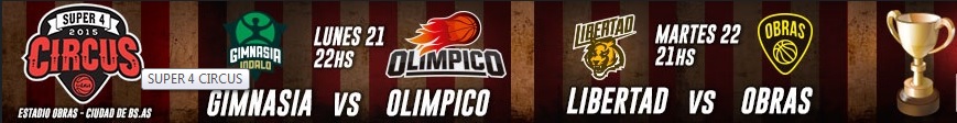 Mañana empezará en el Templo del Rock el Súper 4 Circus, participaran el local, Obras Basket, dirigido por Trifón Poch, Libertad de Sunchales, Gimnasia Indalo de Comodoro Rivadavia y Olímpico de La Banda, será la quinta edición de este certamen, las anteriores fueron dos veces en el 2002, otra en el 2003 y la última en el 2004, luego se lo remplazo por el famoso Súper 8 y ahora volvió al anterior formato con el propósito de abaratar costos.
