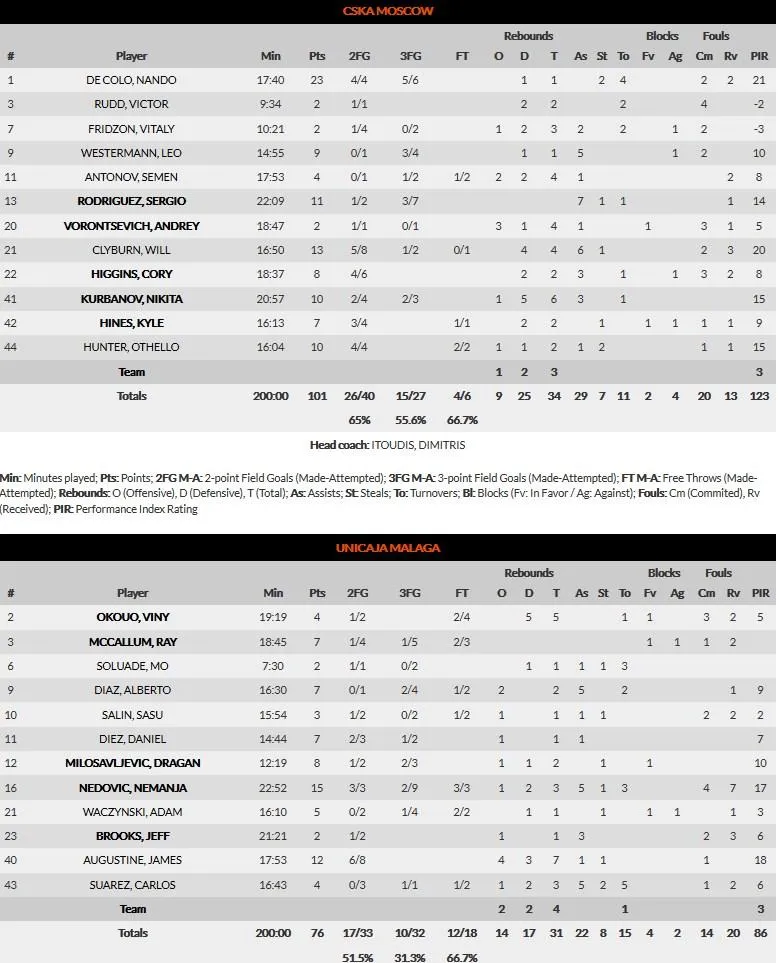 CSKA marcó el ritmo de partido desde el arranque. Un intercambio de canastas en los que Kurbanov y Rodríguez llevaban la manija del partido mientras que Milosavljevic daba la réplica por parte de Unicaja. El ritmo anotador y el acierto ofensivo de CSKA, con un Hunter muy acertado llevaba a los locales a elevar sus rentas. Un parcial 2-12 de Unicaja limaba desventaja pero al descanso se llegaba con un 57-43.