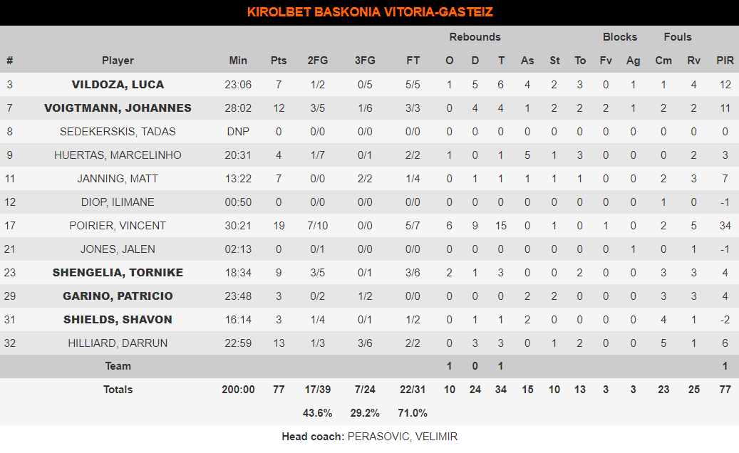 Vincent Poirer: El pivot francés volvío a ser clave para que los gasteiztarrak se mantuviesen en el partido. Terminó la primera mitad con 10 puntos y 7 rebotes. En la segunda parte con apenas descanso, terminó el partido 19 puntos y 15 rebotes, sacándole las 5 faltas a Othello Hunter y siendo así el más valorado del encuentro con 34.