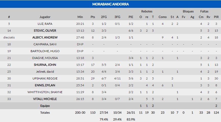 Despierta Reggie Upshaw. El americano es uno de los fichajes en que los andorranos tienen muchas esperanzas puestas dado su talento y juventud, pero hasta ahora no estaba rindiendo a gran nivel (5’7 puntos y 4’7 de valoración en ACB). Hoy se ha soltado por completo y el acierto que ha tenido le ha dado la confianza para tomar responsabilidades en ataque (18 tiros de campo con 4 de 11 en triples). Sus 29 puntos han sido la principal clave para que Morabanc Andorra se llevase el partido y completase un recital ofensivo con 110 puntos anotados.