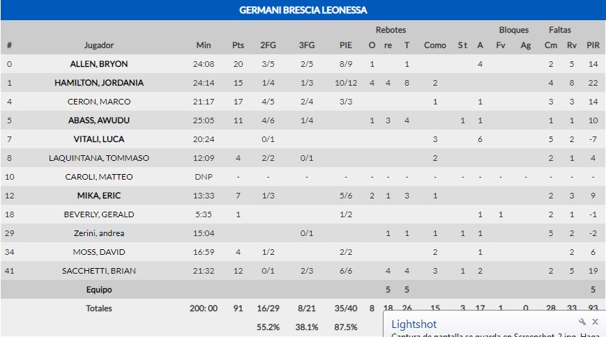 El duelo entre hermanos no estuvo demasiado acertado. Se encontraron en la cancha el alero Michele Vitali contra su hermano, el base ex ACB Luca Vitali. Quizás este hecho emocional provocó los nervios entre de los dos familiares, ya que Michele se fue con un 0 de 7 en triples mientras que Luca solo tiró una vez a canasta y falló, además de realizar un partido horrible con un -7 de valoración.