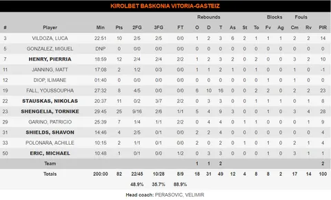El capitán pone los puntos: No hay ninguna duda que Tornike Shengelia es el emblema de Kirolbet Baskonia, y un partido más lo demostró. Con Fall dominando en la zona, se aprovechó de la incidencia de su compañero para ser un martillo pilón contra Olympiacos. Con un 50% en tiros de campo hoy (11/22), se sintió muy cómodo en su cancha anotando de casi todas las formas posibles. Cerraría su participación con 25 puntos, 9 rebotes, 3 asistencias y 28 de valoración.