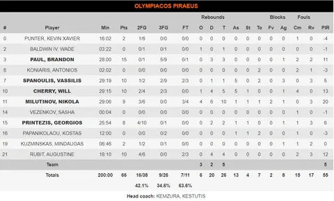 No fue la noche de Spanoulis: El capitán de Olympiacos no tuvo su día en Vitoria. Con poca influencia en el juego, los árbitros respetaron mucho su figura a la hora de señalar determinadas faltas. En el tiro estuvo bastante errático con una serie de 2/9 en lanzamientos de tres. Pero no solo eso, sus dos pérdidas y tres tapones recibidos fueron señal de que no estaba fino el mítico base griego.