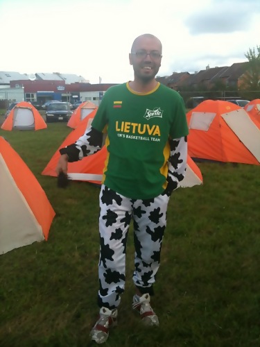 Cada día se van viendo más aficionados españoles que van llenando de color y alegría las calles. Algunos se alojan en Vilnius y viajan a Panevezys para ver los partidos. Otros están durmiendo en un campamento que se ha creado en Panevezys para poder alojar a las diferentes aficiones. En este campamento hay un ambientazo. Un par de aficionados británicos, mayoría aquí, me decían que no había muchos españoles pero que había uno muy fácil de reconocer, porque iba siempre disfrazado de vaca y con una camiseta de Lituania. No podía ser otro que Paco, un español que desde el Eurobasket de Polonia sigue fiel a su tradición de ir a los partidos con su camiseta de Lituania. Repitió en el Mundial de Turquía y como no, tenía que seguir aquí.