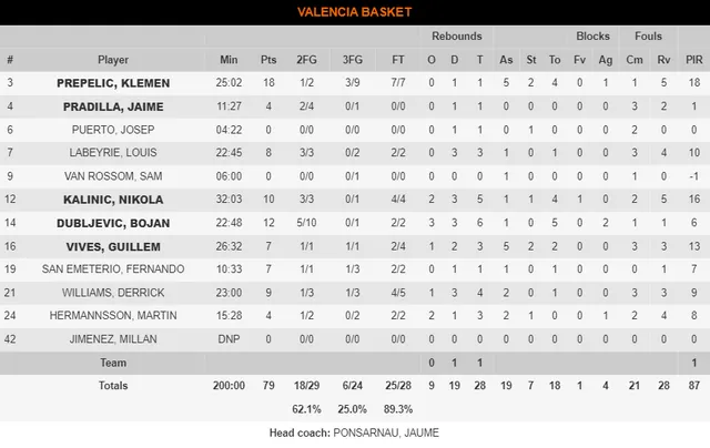 El conjunto dirigido por Andrea Trinchieri acabó con un porcentaje superior al 50% en el tiro exterior y con lanzamientos de tiro exterior claves como el que anotó Vladimir Lucic en los últimos minutos del cuarto cuarto y que rompía definitivamente el encuentro. Tanto él como Zipser fueron los jugadores principales en esta faceta. Sin embargo, esa fue la parte más débil en el partido de Valencia Basket, en la que se notó la baja de Vanja Marinkovic, lesionado del hombro. Los ‘taronja’ acabaron con un porcentaje de tan solo 25% de acierto al anotar solo seis tiros de 24 intentos, la mayoría de ellos de parte de Prepelic.