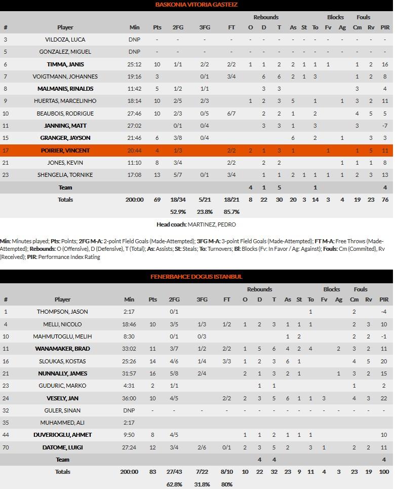 El Fenerbahce avasalló al Baskonia con su buen movimiento de balón en ataque. Esto unido a la calidad de los jugadores turcos acabó por sacar del encuentro a los vitorianos. Con esta victoria el equipo de Obradovic vuelve a ganar en el Buesa Arena, donde no lo hacía desde el 2004.