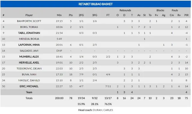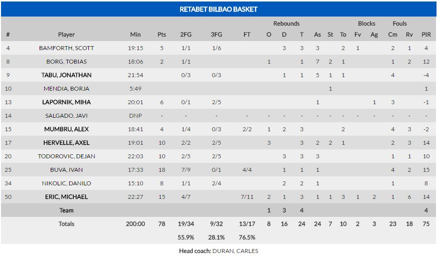 4- Intentarlo hasta desfallecer. Para quien vea el resultado puede sonar irrisorio, pero la actitud de los jugadores de Carles Duran, frente al buen hacer de los rusos, ha sido impecable. Luchando, tratando de defender lo mejor posible y sin bajar los brazos ni un solo segundo. La segunda unidad de los Hombres de Negro, en especial, daba una imagen de firmeza y fortaleza mental realmente encomiable. Mención especial para la actitud de los Dejan Todorovic, Ivan Buva, Danilo Nikolic, Miha Lapornik o Tobias Borg, que han anotado más puntos que el quinteto inicial (35-43), han perdido menos balones (7-3) y han dado más asistencias (9-15).