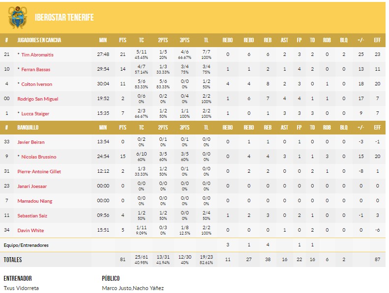 3 Tim y Nico, Nico y Tim: primero el otro Nico argentino, después el hijo de Jim. Una primera parte soberbia de Brussino y un tercer cuarto para enmarcar de Abromaitis. Eso y mucho más para hacer tumbar a gigantes y acceder a los juegos decisivos del primer fin de semana de mayo. Los triples sin fallo del alero argentino en el primer cuarto cimentaron, con la intensidad defensiva, las primeras ventajas. La versatilidad del ala-pivot de origen lituano terminaron por cimentar la victoria canaria hasta en modo de calma. Hoy, tanto Tim como Nico, Nico como Tim.