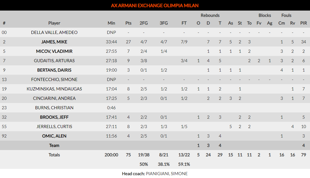 Porcentaje de tiros: El Baskonia comenzó errando demasiado desde el lanzamiento. Consiguió remontar la situación a partir de la segunda mitad y jugando a su vez a un ritmo muy alto. Armani en cambio, tuvo el efecto contrario con un alto nivel de acierto al inicio con Mike James de lider, pero pasando factura después sin él en cancha. Desde la línea de un punto también tuvieron problemas, sobre todo en los momentos claves. 13/22 y fallando 4 tiros libres de 9 en los dos últimos minutos.