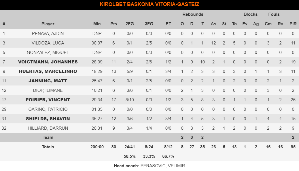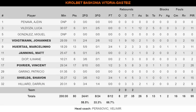 Johannes Voightmann, Shavon Shields y Vildoza: se conjuntaron muy bien en aquellos momentos que coincidian en cancha. El alemán jugando de ala-pivot, se le vío muy activo y con mucha confianza, atreviéndose a subir el balón en varias acciones del partido. Este dinamismo que el alemán aportaba también beneficiaba al juego de Shavon Shields y Luca Vildoza, conectando con éxito y generando un movimiento muy rápido de balón con grandes opcines de tiro.