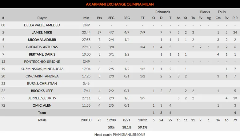 Mike James: Entre pitos y aplausos entraba en el pabellón para después salirse contra su ex equipo. El estadounidense fue la única referencia de los italianos durante todo el partido. Anoto en la primera mitad 17 y 10 puntos en el último cuarto para irse hasta los 27 puntos, 7 rebotes, 5 asistencias para un total de 34 de valoración.