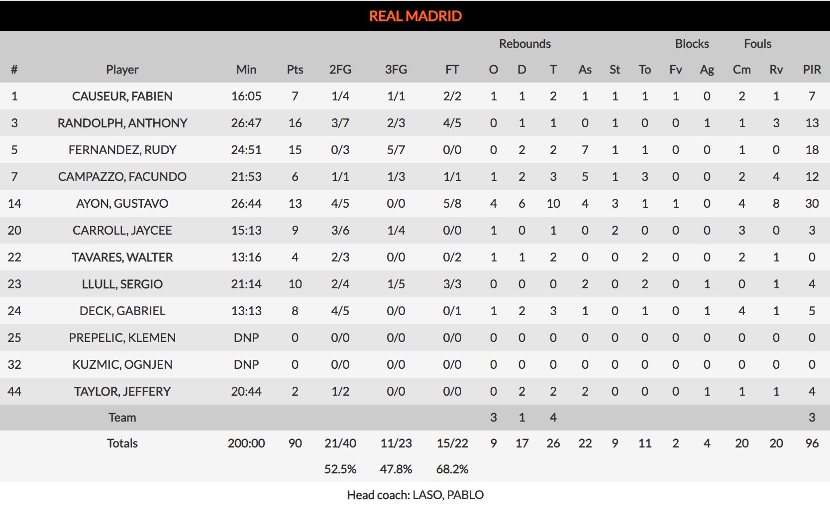 Fundamental la figura de Gustavo Ayón, haciendo de balanza a ambos lados de la cancha en el partido que más le necesitaban (contrastando con el peor de Tavares). El mexicano volvió a cancha para ser el guía de los suyos, tanto con su defensa (9 rebotes, 3 robos, 1 tapón), como con su dirección desde el poste (3 asistencias) y evitar que el Madrid se viniese abajo tras un triple envenenado de Milaknis a falta de 7 minutos. Mucho más lejos de eso, la versión titánica de Ayón conseguía empatar el partido en el minuto 34, firmando además ya un doble-doble (11+10).