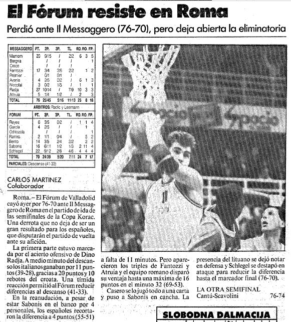 Una semifinal donde esperaba Il Messaggero de Roma, quinto clasificado de la liga italiana. Un hueso muy duro de roer que contaba en sus filas con el croata Dino Radja y, el dos veces campeón de la NBA con los Pistons, Rick Mahorn. Sacar un resultado favorable en la cancha italiana era una tarea laboriosa, tan difícil que la expedición pucelana buscó una pequeña ayuda divina en una recepción con el Papa Juan Pablo II.