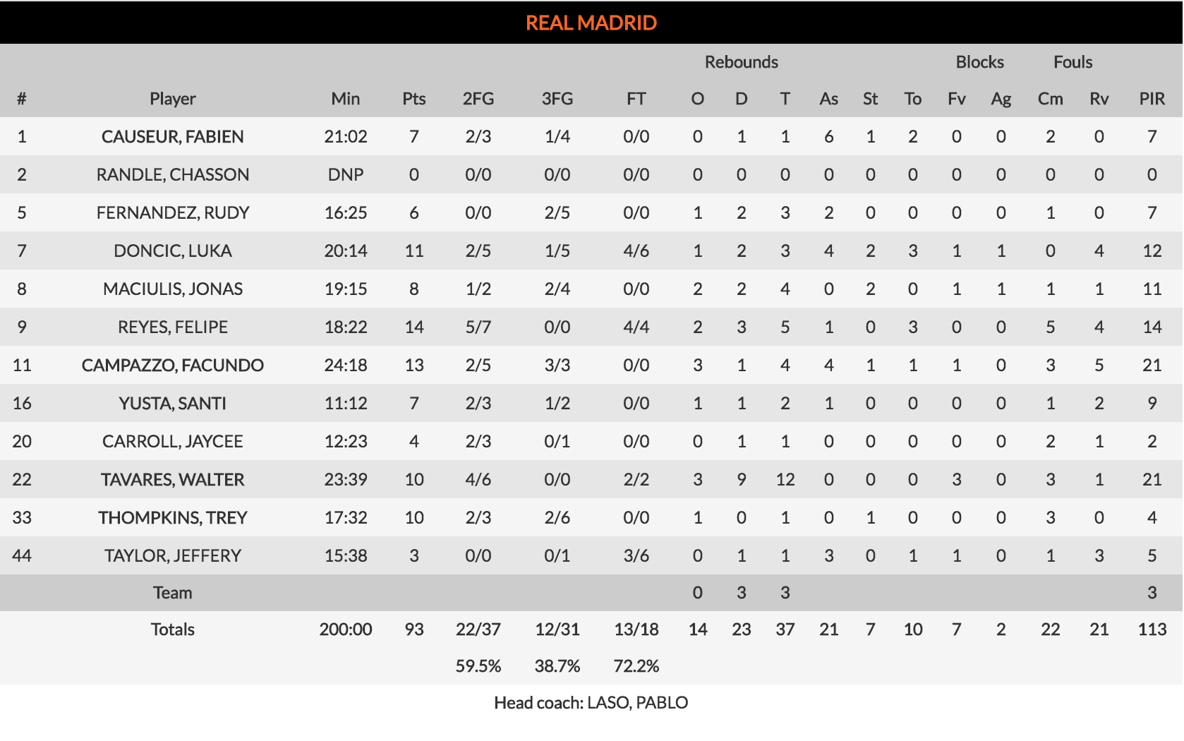 El ABC del baloncesto: defender y correr. Así rompió el Real Madrid el partido en el tercer cuarto. Forzaron los cinco segundos en un saque de banda y ello desatascó al equipo después de un mal inicio de cuarto. Doncic fue relegado al banquillo y Campazzo se hizo con las riendas de forma magistral. La intimidación de Tavares en la zona (que firmó su mejor partido en el Real Madrid: 10 puntos y 12 rebotes) dejaba el resto del trabajo en manos de Thompkins o Carroll, que fueron los principales artífices del definitivo parcial.