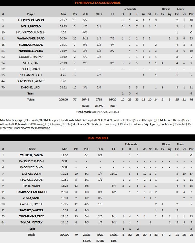Con Luka Doncic desatado, el conjunto de Obradovic comete una falta antideportiva que permite al Real Madrid mantener la máxima ventaja del partido. A pesar de la primera aportación de Melli, el conjunto de Obradovic se ve incapaz de volver a anotar lo que restaba de partido. Wanamaker, a pesar del gran partido con 20 puntos, 2 rebotes y 5 robos para el +23 de valoración, falla tres tiros consecutivos para empatar e incluso ganar el partido, haciendo que su equipo se quedara por debajo del 50% en tiros de 2 y se quedarán sin posibilidades de jugar una prórroga.