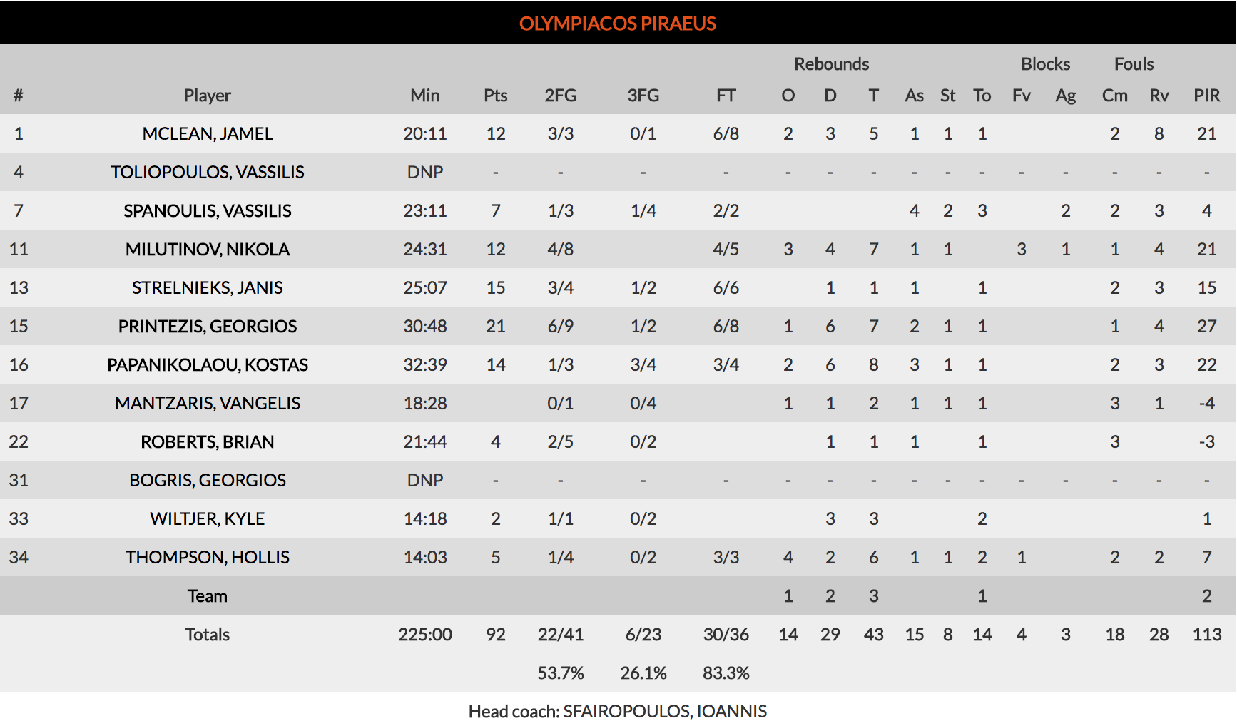 2. Demasiados frentes abiertos en el Olympiacos… Los locales cubrieron de forma coral el mal partido de Spanoulis (7 puntos – todos ellos en la primera mitad – y 4 asistencias). Primero fueron Nikola Milotinov (21 de valoración) y Papanikolaou (22 gracias a sus 14 puntos y 8 rebotes) quienes acompañaron a la leyenda de Olympiacos para dar la vuentaja a los suyos en la primera mitad. En la segunda, despertó el poderío en la pintura de McLean, cuyos 2+1 sentaban como un jarro de agua fría en plena remontada blanca. El americano acabó con 12 puntos, 5 rebotes y 21 de valoración. El héroe final fue Printezis, que acabó siendo el mejor de los suyos con 21 puntos y 7 rebotes para 27 de valoración. Todo ello, bajo la magistral dirección del letón Strelnieks, impecable desde los tiros libres y fulminante con un triple en el último cuarto.