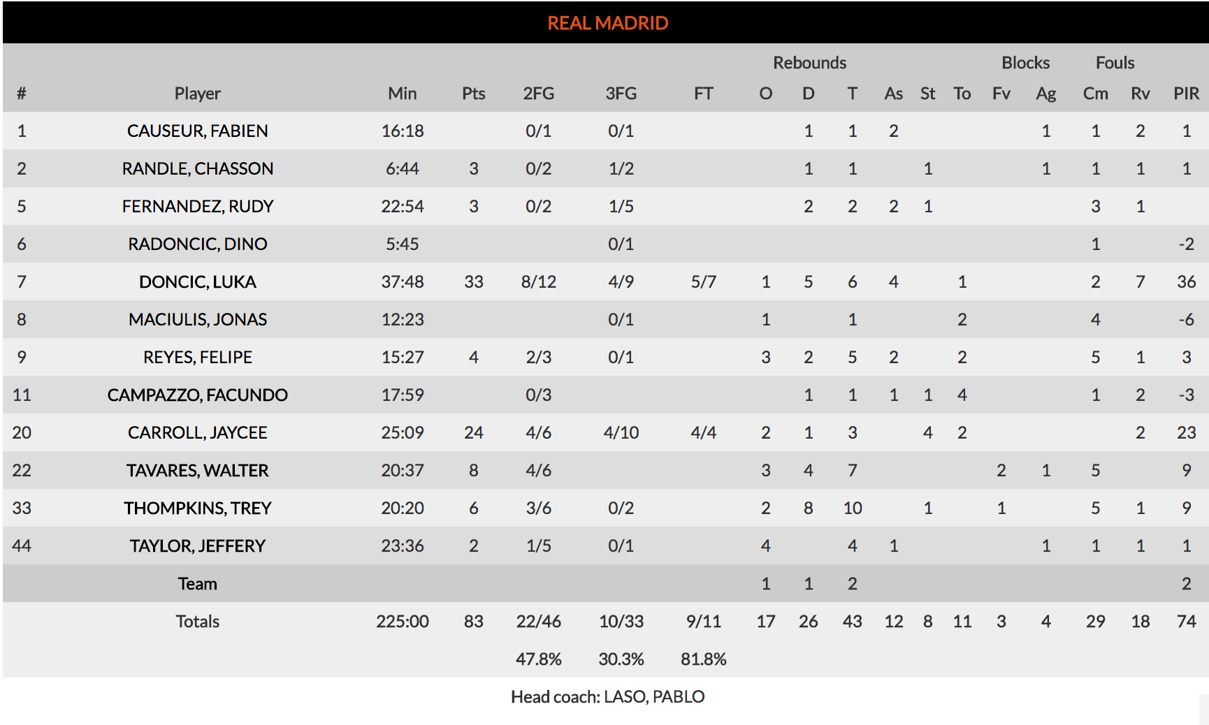3. …frente a la excesiva dependencia de Jaycee Carroll y Luka Doncic. Ambos jugadores se combinaron para anotar 57 puntos. Casi el 70% del total de su equipo. Un partido de "reconciliación" para el de Wyoming (promediaba hasta hoy 5,7 puntos en competición europea), que no dudó en tomar las riendas en el momento más calientes, anotando auténticas virgerías (algunas de ellas merecían ser premiadas, además, con adicional) y anotando el triple que empató el encuentro. Desapareció en la prórroga y perdió un balón clave. El esloveno, por su parte, firmó su (enésimo) mejor partido de la temporada, batiendo su récord personal de puntos y añadiendo 6 rebotes y 4 asistencias en el partido que más minutos ha jugado en toda su carrera. 59 de valoración entre ambos, por 13 del resto del equipo. Una estadística demoledora.